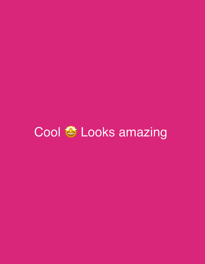 The image displays a solid magenta-pink background. Centered horizontally and slightly above the vertical midpoint, white text reads "Cool" followed by a yellow emoji depicting a smiling face with two yellow stars for eyes. Immediately to the right of the emoji, more white text reads "Looks amazing". There are no discernible people, subjects, objects, actions, interactions, or environmental features related to a city like Milan, Italy, present in this image.