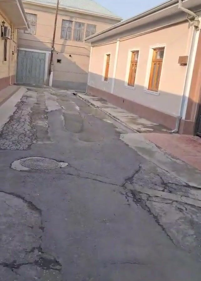 The camera films a narrow street with cracked asphalt between low buildings, under a light blue sky