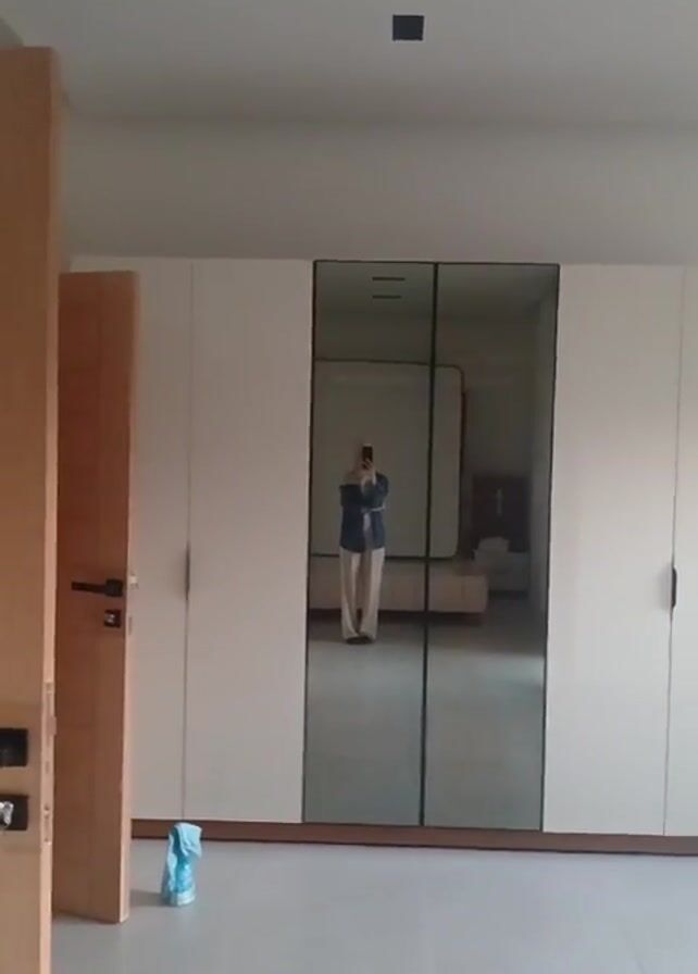 sparsely furnished room with a large built-in closet. The closet has white doors on either side and a set of mirrored doors in the middle. A person holding a phone is reflected in the mirror, wearing a hijab, a blue shirt, and beige pants. The room is brightly lit and appears empty except for a blue package on the floor and a view into an adjacent room with a bed and bedside table visible in the mirror's reflection. The camera is static.