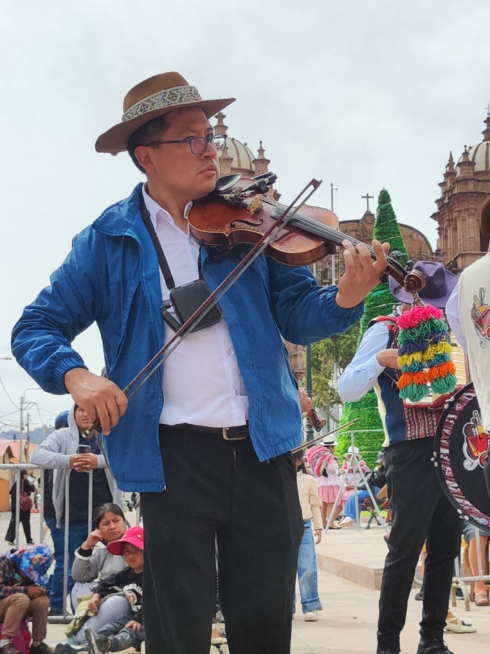 A man in a brown hat and glasses is playing the violin in a public square. He's wearing a blue jacket over a white shirt and black pants. A camera or device hangs around his neck. In the background, there are people, buildings with domes, and a decorated tree, suggesting a festive or cultural event. Another musician and a crowd of people are visible in the periphery.