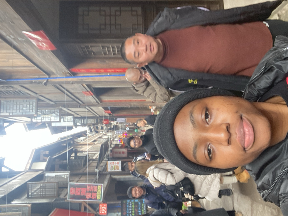 A selfie captures two men in a crowded outdoor market. The first man wears a black beanie and jacket. Behind him, a second man wears a maroon long-sleeved shirt and a dark jacket. The market is filled with people, most appearing Asian. Numerous storefront signs with Chinese characters hang above. The architecture is traditional Chinese, with wooden buildings and decorative window frames. The lighting is overcast, suggesting a cloudy day.