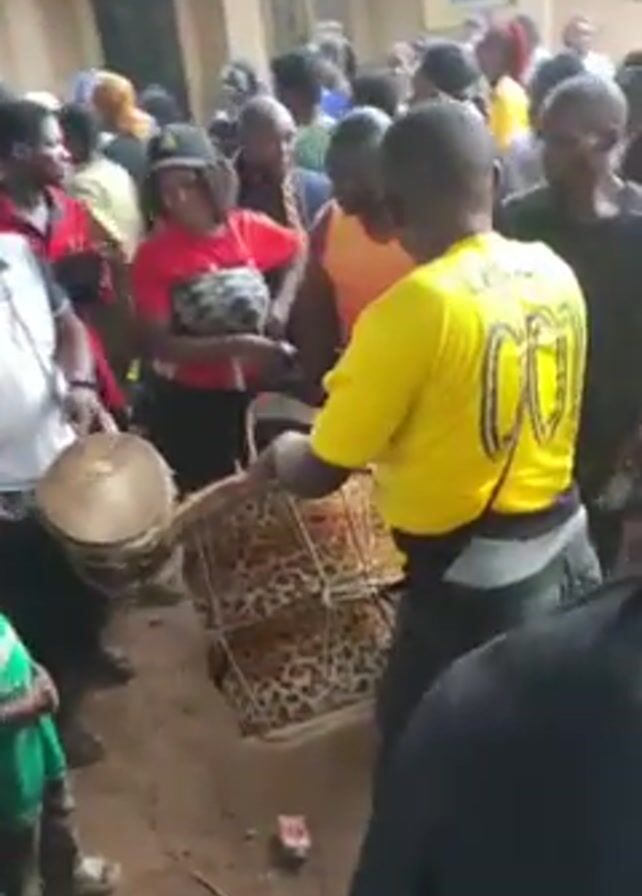 A crowd of people, mostly adults, dance and celebrate around three drummers in an outdoor space. The drummers beat on traditional African drums. Most of the people are dancing and clapping. A few are just watching. The environment is a courtyard in front of a light-colored building with windows and doors. There appears to be dirt underfoot with some sparse vegetation. The weather seems to be clear and bright. The people are dressed in a variety of casual clothing, with no obvious uniformity.
