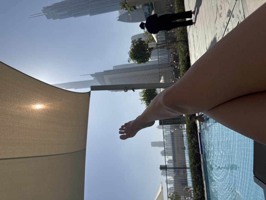 The image depicts an outdoor swimming pool area in Dubai, United Arab Emirates, with a panoramic view of the city's skyline, likely from a high-rise perspective in Downtown Dubai or Business Bay. The scene is presented from a first-person viewpoint, featuring a pair of bare legs, crossed at the ankles, positioned in the lower-right and central-left foreground. The right foot is raised and pointed upwards, with five toes discernible. Above, a light-beige fabric sunshade covers the upper quarter of the frame, through which the sun creates a bright, localized glare on the upper left. In the midground, a clear blue swimming pool occupies the left side, displaying ripples on its surface. At least two individuals are visible within the pool; one child, seen from behind, is near a purple inflatable object, and another person is partially obscured further back. The pool is bordered by a light-colored tiled or paved deck and a dark metal fence. Small, green, manicured trees are intermittently spaced along the fence line. On the right side of the deck, a person dressed in dark clothing, including a dark hat, stands barefoot, facing away from the camera. The background reveals a hazy yet distinct cityscape under a clear blue sky. Numerous modern skyscrapers populate the horizon, with a notably tall and slender building featuring pointed spires prominently visible on the far right. Multiple other high-rise structures of varying architectural designs stretch across the distant urban landscape.