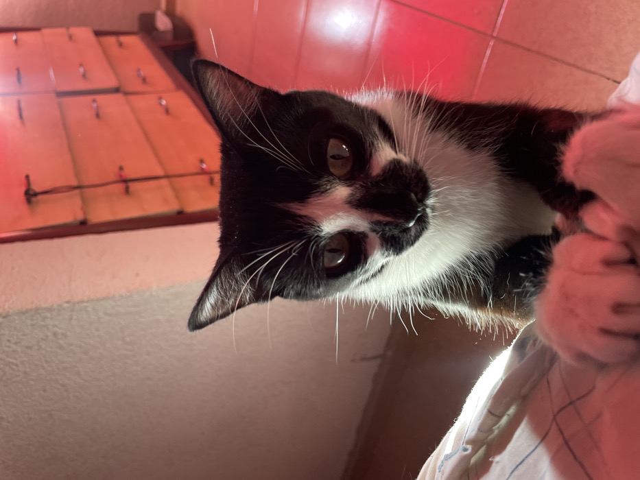 The scene is located in a room in the city of San Sebastián de Aparicio, Mexico. The primary subject is a domestic cat, specifically a tuxedo cat, positioned in the foreground and looking directly at the viewer. The cat displays black fur on its back, head, and part of its face, contrasting with a white chest, belly, and paws. A white blaze runs vertically between its eyes, which are dark, reflective, and show dilated pupils. Its ears are upright, and prominent white whiskers extend from its muzzle. The cat's front paws are visible at the bottom of the frame, resting on a light-colored, possibly fabric, surface with faint grid patterns. The background is dimly illuminated by a strong reddish-orange light source. To the left, a textured, light-colored wall is visible. To the right and rear, a wooden dresser or cabinet with multiple drawers and dark pull handles is present, with a dark cable hanging along its side. The floor, visible on the far right, appears to be tiled.