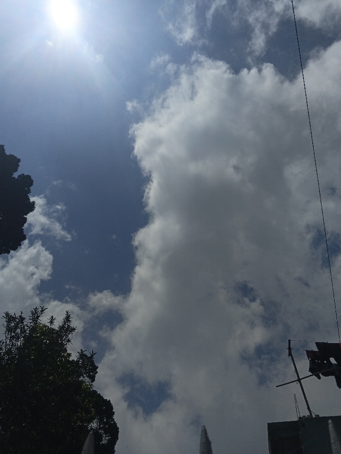 The sky is mostly blue, but partly cloudy. The sun shines brightly from the upper left. Fluffy white and gray clouds fill the right side of the frame. Trees with dark green leaves are visible on the left. A building and clothes hanging on a line are on the bottom right. Power lines run vertically on the right side.