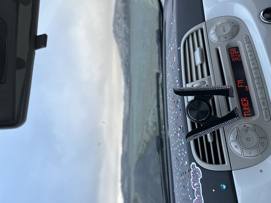 The image provides a view from the interior of a vehicle, looking out onto a rural or semi-rural landscape within Frontenas, France. A paved road extends into the distance, flanked by fields that appear covered in a light frost or winter vegetation. In the background, undulating hills are visible under an overcast, grey sky. Inside the vehicle, the black dashboard is customized with numerous small, multi-colored dots (including red, white, pink, blue, yellow, orange, green, and black) and two stickers on the left: a purple and white text sticker, and a small blue glitter heart sticker. A black phone holder, embellished with small rhinestones, is clipped to one of the central air vents. Below it, a white car radio console is visible, displaying "TUNER FM," "87.50" (frequency), and "CD-IN." The base of the windshield wipers and the lower edge of the rearview mirror are also present. The dashboard design and radio unit are consistent with a Fiat 500 vehicle. No individuals are visible in the scene.