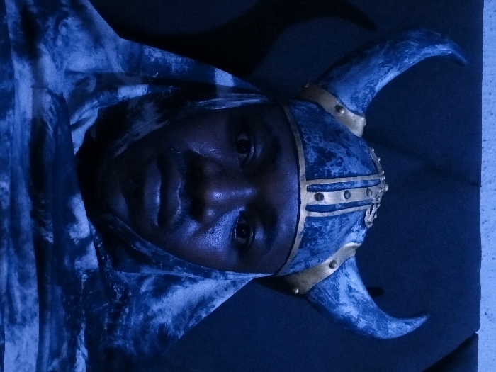 A person is depicted in a blue-toned image, appearing to wear a horned helmet. The helmet is embellished with gold-colored accents. Part of their head is covered in what looks like a draped cloth with a mottled pattern. The individual's face is centered in the frame, with their gaze directed toward the viewer. The lighting casts strong shadows, particularly around the nose and eyes, creating a dramatic effect.