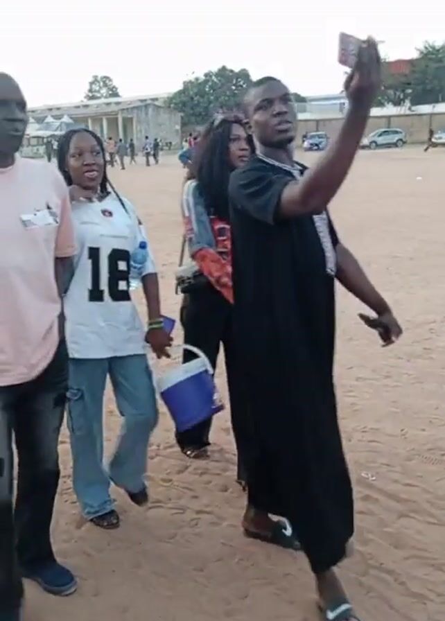 The video depicts a group of people walking across a sandy field. The first person shown is a man in a black robe holding up a cell phone. A woman in a football jersey and blue jeans walks next to him, carrying a blue bucket. As the camera pans, an older man in a pink shirt and faded jeans walks into view, followed by more people. One woman is wearing a red and black plaid shirt and a black beanie, while another carries a teal cooler. In the background, there are other people, cars, and buildings. The sky is overcast.