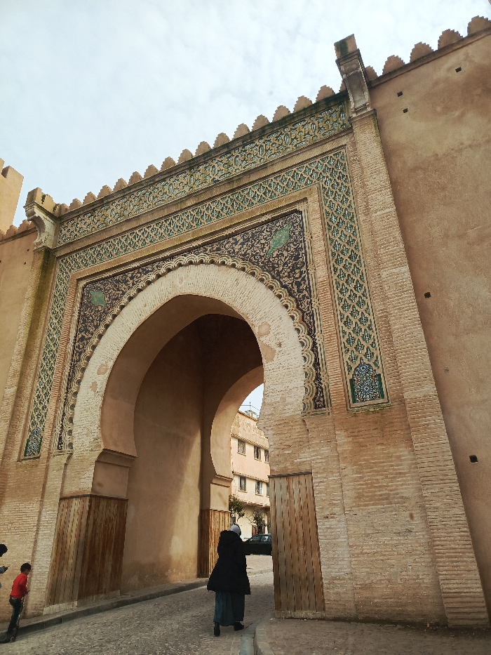 A low-angle shot captures a tall, ornate gateway constructed of light-brown brick. The archway is framed by intricate tilework featuring geometric and floral patterns. A woman in a dark coat and hijab walks through the arch, while a child in a red shirt stands to the side. The background reveals buildings in the distance. The sky is overcast.