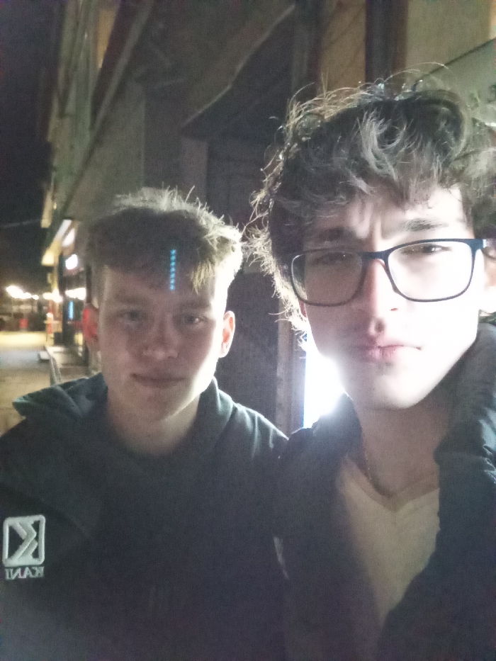 The image captures two young males standing outdoors at night in Troyan, Bulgaria