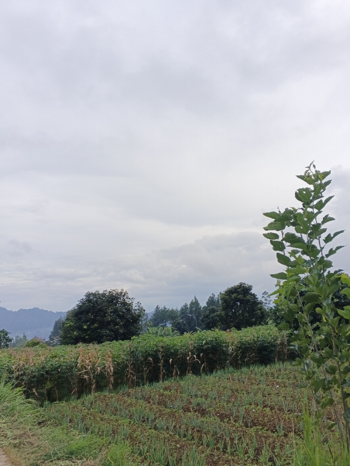 The image depicts a rural landscape in São Félix do Xingu, Brazil, under an overcast sky. The sky occupies the upper half of the frame and is uniformly light gray, indicating complete cloud cover with no direct sunlight. In the foreground, a narrow, unpaved path with sparse green grass runs along the bottom left. Adjacent to this path, and extending across the lower portion of the image, is a cultivated field. This field contains multiple rows of small, green, upright plants, consistent with young allium crops, rooted in dark brown soil. Behind these, a denser row of bushier green plants is visible. On the far right, a young tree with vibrant green, multi-lobed leaves extends vertically, partially cropped at the top and bottom. The midground features a line of taller, partially dried stalks, likely corn, forming a distinct boundary behind the shorter green crops. Further back, a dense band of various trees and shrubs, predominantly green, stretches horizontally across the scene. This arboreal line includes dark green, rounded deciduous trees and lighter green, somewhat conical evergreens. A small, reddish-brown roof of a structure is faintly visible within the foliage on the far left midground. The background consists of a range of distant, hazy mountains or hills, appearing bluish-green and covered in dense vegetation, receding towards the horizon under the overcast sky. No people, animals, or active human interactions are visible within the scene.