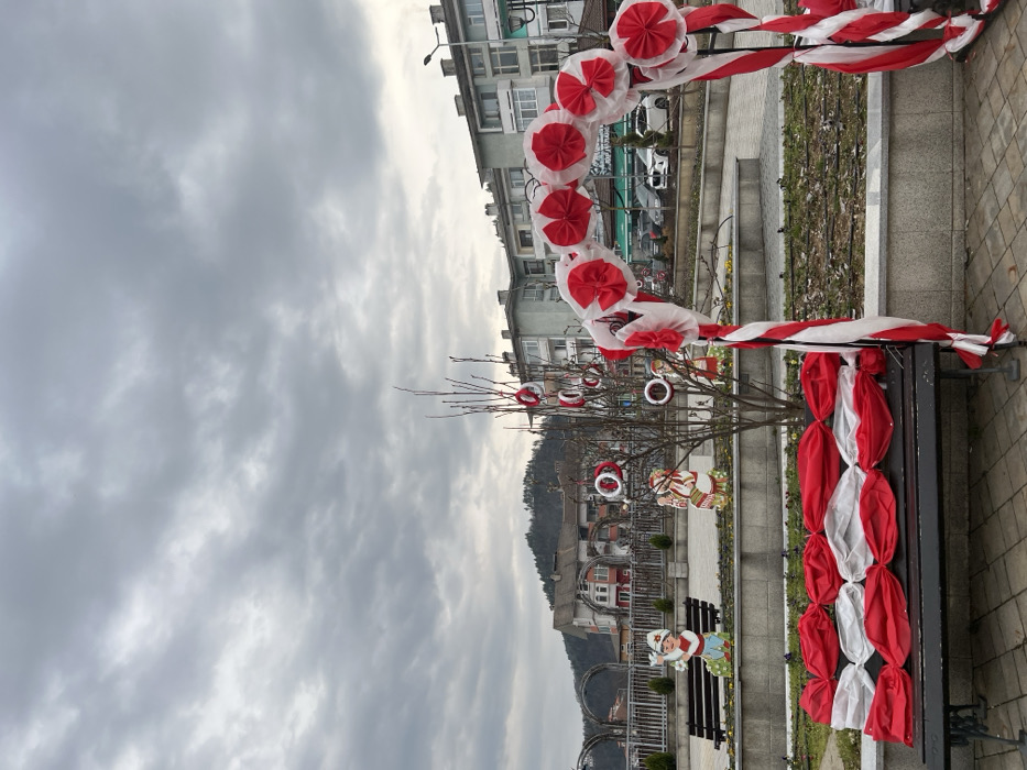 The image depicts an outdoor public square or park in Nedelino, Bulgaria, under a uniformly overcast, grey sky. In the foreground, a dark-colored park bench is heavily decorated with alternating red and white fabric bundles, creating a striped pattern. To its right, a black metal archway, approximately 2.5 meters high, is adorned with large red and white fabric bows and spirally wrapped with striped red and white fabric. Behind the decorated bench and archway, a leafless deciduous tree stands, decorated with circular red and white ornaments. Immediately behind these foreground elements, within raised concrete garden beds containing sparse vegetation and some small yellow flowers, stand multiple stylized figurines, each approximately 1 meter tall, depicted in traditional Bulgarian folk costumes, predominantly in red and white. One figure on the left holds a white bird. Further back, undecorated dark-colored benches are visible along paved pathways. The background features several multi-story buildings with light-colored facades, numerous windows, and some balconies, indicative of urban residential or commercial structures. A street with several parked vehicles is visible in front of these buildings. Beyond the urban structures, tree-covered hills rise against the horizon under the cloudy conditions. A black streetlamp is visible in the upper right portion of the frame. No individuals are present in the scene.