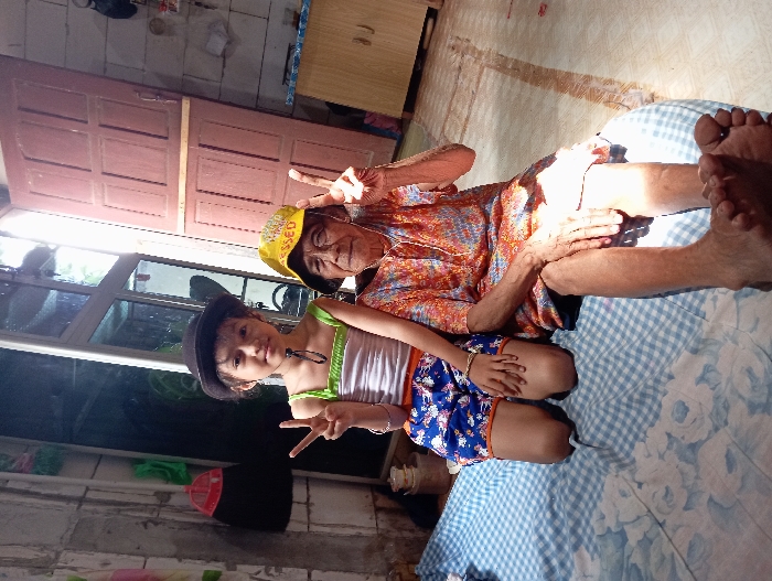 - "A child wearing a black hat, white tank top, and blue patterned shorts kneels beside an elderly woman in an orange floral top and yellow baseball cap" by FM-TnUEx2, licensed under CC BY 4.0