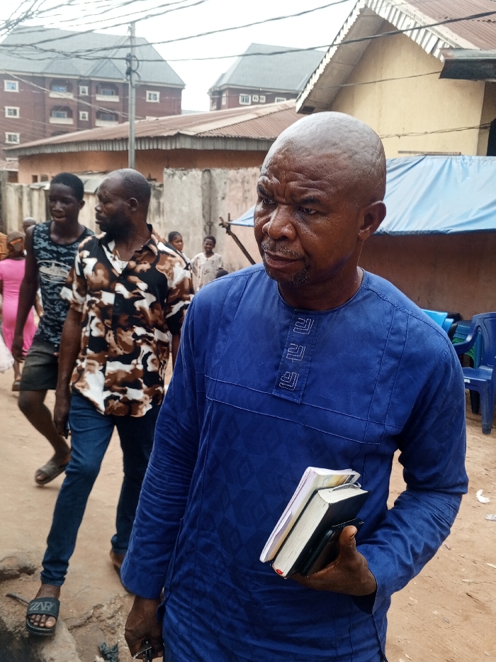 The image captures an urban street scene in Onitsha, Nigeria, under an overcast sky. In the foreground, a bald adult male with stubble on his chin wears a blue, long-sleeved tunic featuring geometric patterns. He holds two books and a dark wallet in his left hand, looking towards the right side of the frame with a neutral to serious expression. To his left and slightly behind, another adult male with a beard wears a short-sleeved shirt with a brown, black, and white camouflage-like pattern, paired with blue jeans and dark sandals, walking towards the left. Behind this individual, a younger male, likely a teenager, wears a dark sleeveless shirt and shorts, also moving left. Multiple blurred figures are visible in the background. The ground is unpaved, consisting of packed dirt and scattered debris. Structures include a partial corrugated metal roof on the right, a light blue tarp covering several blue plastic chairs, concrete walls, and in the distant background, multi-story buildings with dark roofs and numerous windows, characteristic of a densely built urban environment.