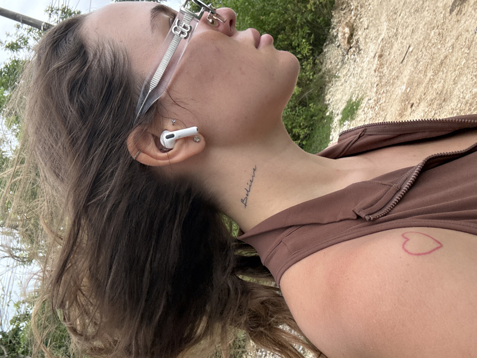 A light-skinned person looks upward, wearing unusual clear-framed glasses and an AirPod in their ear. A neck tattoo reads "Believe" in script. A brown, zip-up top is visible. On the upper arm is a faded red-ink heart tattoo. The background shows a mix of greenery and a gravelly path, suggesting an outdoor setting.