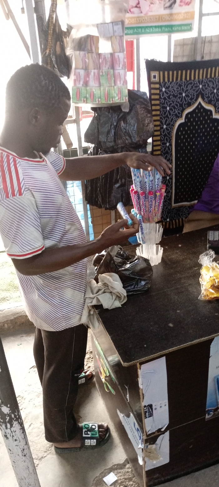 A person wearing a striped shirt and dark trousers stands at a dark-colored counter. They appear to be arranging tubes of "sojue mentos" candy in clear plastic containers. The counter is also cluttered with black plastic bags and other items. In the background, there are various goods on display, including what looks like prayer rugs and stacked packages. A sign with phone numbers and "Shop A28 & A23 Jaba Plaza, Kang State" is visible above the counter.