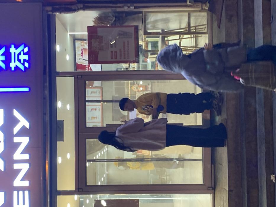 The image depicts a nighttime street scene in Zhongtun, China, in front of a beverage shop named "JENNY 茶" (JENNY Tea). The store's illuminated sign displays "JENNY" in white neon and the character "茶" in blue neon above a glass storefront with double doors. Three individuals are prominent in the foreground. To the left, a woman with long dark hair, wearing a light-colored cardigan over dark pants, stands facing slightly right, her back mostly to the camera. She appears to be interacting with a young boy positioned to her right. The boy wears a yellow long-sleeved shirt featuring a Mickey Mouse graphic, dark cargo-style pants, and patterned sneakers. He holds a small, dark object in his hands. To the right, a third individual walks from right to left, partially obscured by the foreground. This person wears a dark, hooded puffer jacket with the hood up, and carries a brown and white patterned tote bag from which a pink plush item is visible. Inside the brightly lit store, various items are visible through the glass: posters displaying beverages, an advertisement board with red text and the phone number "15241533368," and several bar stools and tables. A person in a yellow garment is reflected in the glass on the left side of the store's interior. The exterior ground consists of several dark-colored steps leading up to the store entrance.