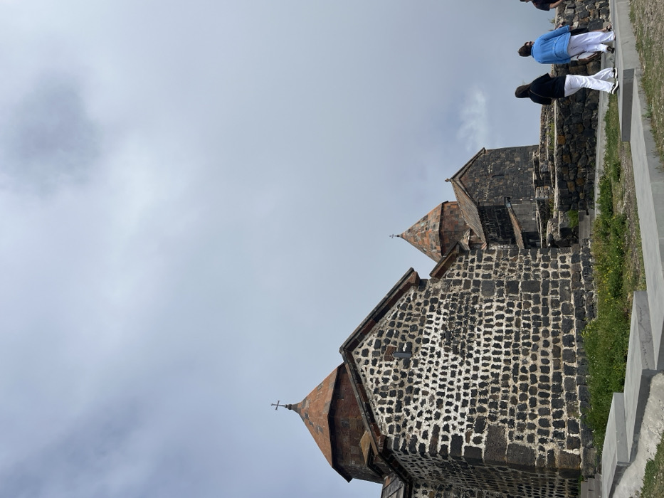A stone church with multiple pointed rooftops and crosses stands against a cloudy sky