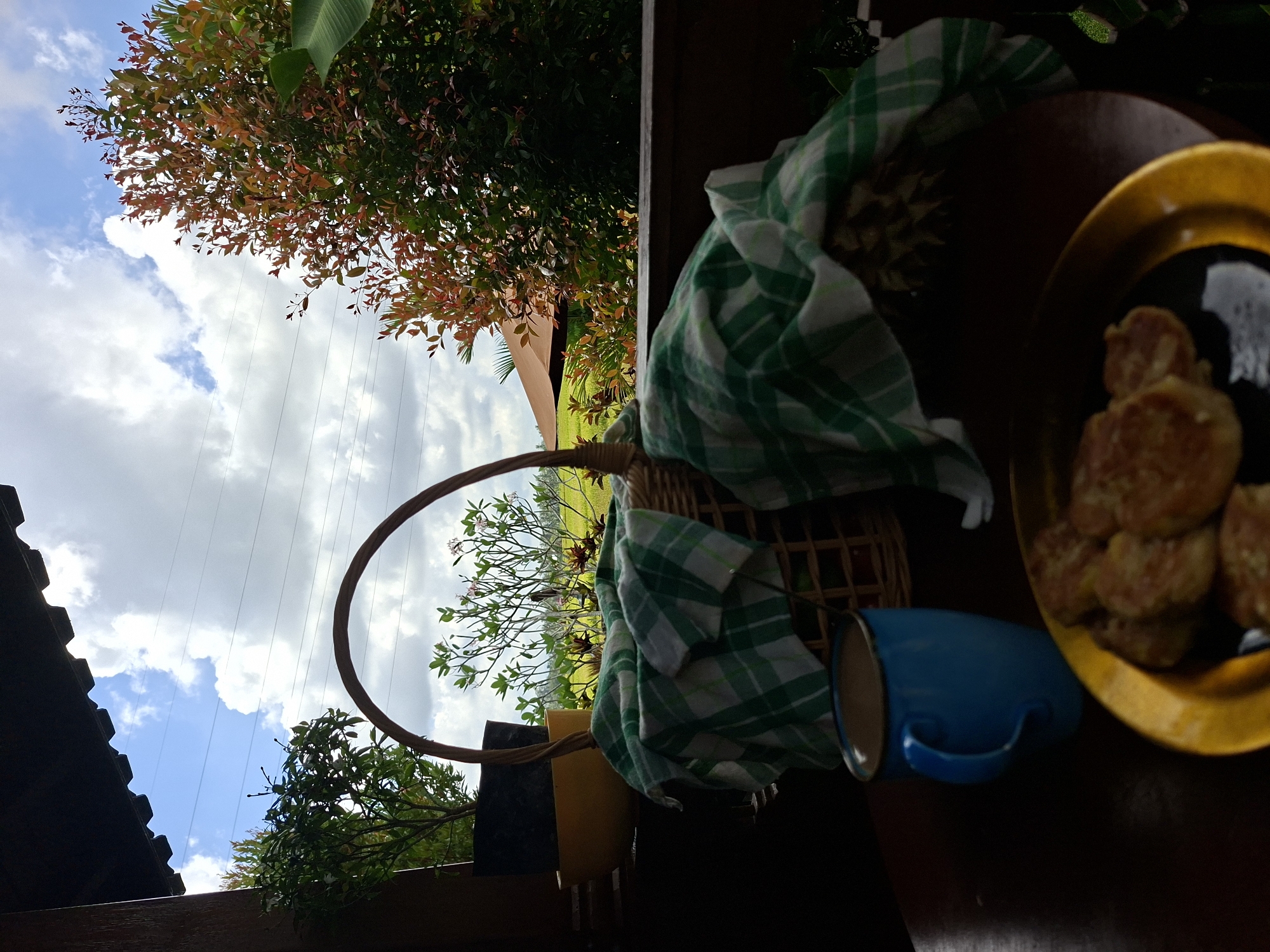 view from what appears to be a balcony or porch in Lodtunduh, Indonesia. The camera is tilted. In the foreground, on a dark surface, is a gold-colored plate piled with what appear to be fried patties. Next to the plate is a blue mug and a woven basket draped with a green and white checkered cloth. The basket contains a pineapple. Through the basket's handle and the gap between the railing and roof, the outdoor scene includes a partly cloudy blue sky and trees with red and green foliage. Parts of a roof are visible at the bottom left. Overhead electrical lines are also visible.