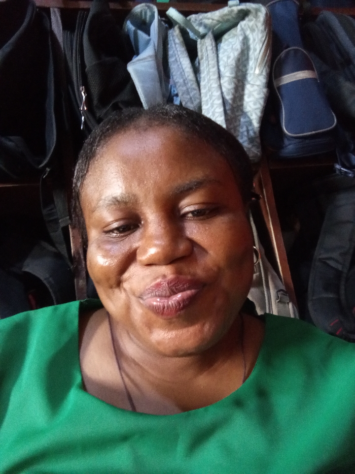 A close-up, frontal portrait of an adult female is depicted. The subject, with medium-dark skin and dark hair pulled back, is smiling with pursed lips and looking directly at the camera. She wears a plain green garment with a rounded neckline and a thin, dark necklace. A small, circular earring is visible on her right ear. The background is composed of a cluttered storage area featuring multiple bags and backpacks of various colors (including black, light grey patterned, and dark blue) and sizes, arranged on shelves or hooks. The scene is set indoors, within a private or personal space in Animashawun, Nigeria.