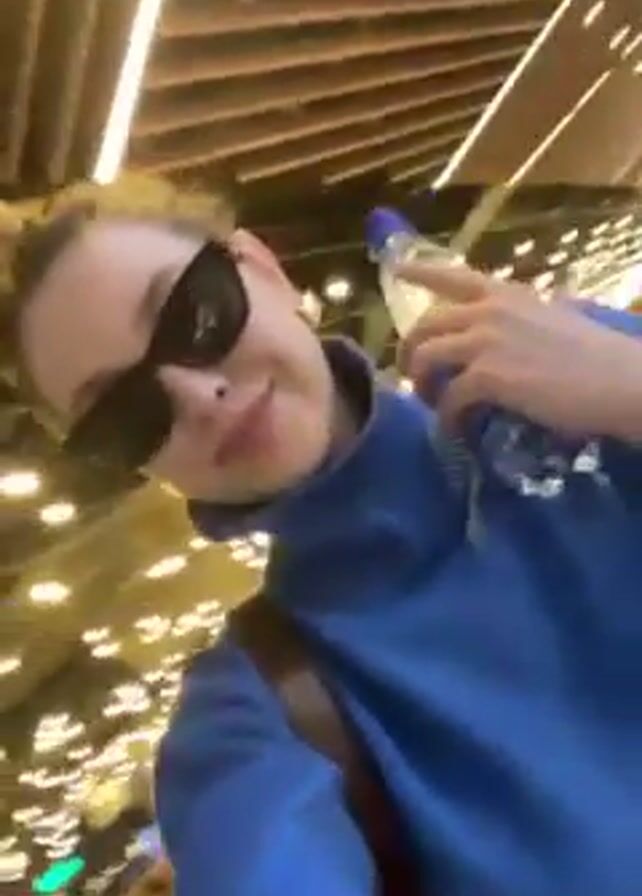 A person wearing sunglasses and a blue turtleneck sweater is holding a bottle of water in one hand and using the other to record a video, possibly a selfie. They are walking in a brightly lit indoor space that appears to be a public area, such as an airport or shopping mall. Other people and various store fixtures are visible in the background, but they are out of focus. The person is smiling slightly and seems to be in motion.
