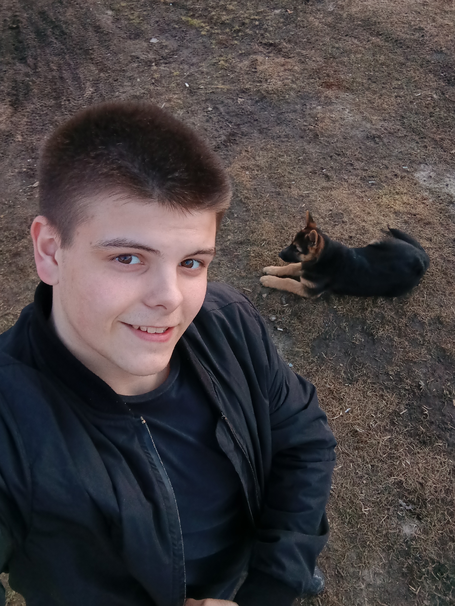 The image captures a young male and a German Shepherd puppy outdoors in Andreyevo, Russia. The male, positioned in the foreground-left, is smiling directly at the camera. He presents with short brown hair, brown eyes, and is clad in a dark, possibly black, zipped jacket over a dark t-shirt. A German Shepherd puppy, characterized by its black body and tan leg and facial markings, is observed lying on the ground in the background-right, oriented towards the left. The ground surface is composed of sparse, dry, light brown grass mixed with patches of exposed soil and scattered minor debris.