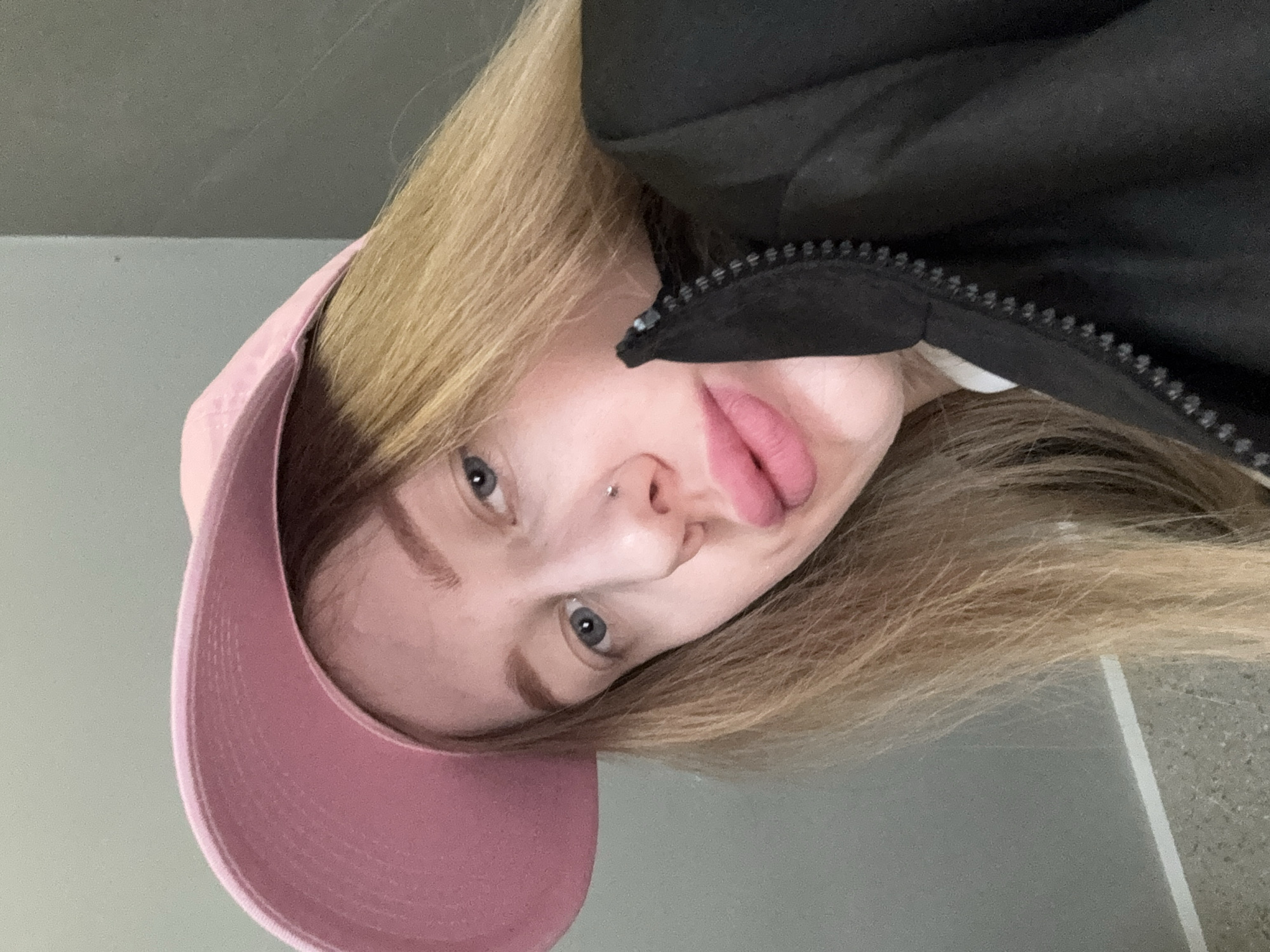 A close-up, tilted selfie depicts a young, fair-skinned individual. They have light brown hair, light eyes, and a nose piercing. The person is wearing a pink baseball cap and a black jacket with a visible zipper. The background is a blurred, nondescript gray-toned surface with a hint of a light-colored vertical line. The location cannot be reliably ascertained as Ovoshchnoy, Russia based on the provided image.