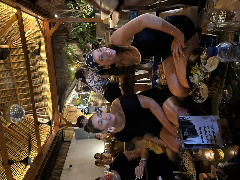 The image captures an evening scene inside a restaurant or bar in Uluwatu, Indonesia. The overhead structure features a high, pitched ceiling composed of woven thatch and dark wooden beams, equipped with multiple ceiling fans and a prominent silver disco ball, all illuminated by warm, artificial lighting. In the immediate foreground, a rustic wooden table is visible with several items. On the left, a black bowl contains pasta, alongside a small lidded container and a glass candle holder with a lit candle. A menu titled "Ulu Fish Market Cocktail Promo" lists "Espresso Martini 110K," "Vodka Lime Soda 110K," and "Sunset Paradise 135K." Towards the center-right, two coupe-style cocktail glasses, one partially filled and one empty, are present next to a black bowl containing salad remnants. A clear plastic bottle of water and a clear glass bottle are also on the table, along with a smartphone displaying an illuminated screen. Three women are seated at this foreground table. The woman on the left, partially visible, wears a black top and a white choker necklace with red elements; her right hand holds a white cigarette. The central woman has dark hair pulled back, wears a black off-the-shoulder top, and large white floral earrings, looking towards the left. The woman on the right has dark curly hair, wears a blue and white patterned bandana, a dark-colored tank top with white trim, gold hoop earrings, and a gold necklace; she is smiling and looking towards the right. In the midground and background, other patrons and staff are visible. At least two female staff members are identifiable, one wearing a black and white patterned shirt. Additional tables, blurred figures of other individuals, lush green foliage, a brick-textured structure, and ambient string lights contribute to the active evening environment.