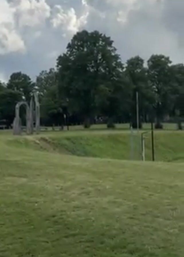 The camera pans across a grassy park on an overcast day