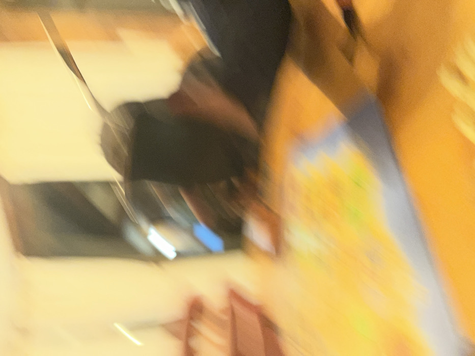The image is blurry and difficult to discern. It appears to depict a person holding an object or device in front of them, possibly with a screen. The color palette consists of yellow, brown, and gray tones. There's a suggestion of furniture or structural elements in the background. The overall impression is chaotic and lacks clear details.