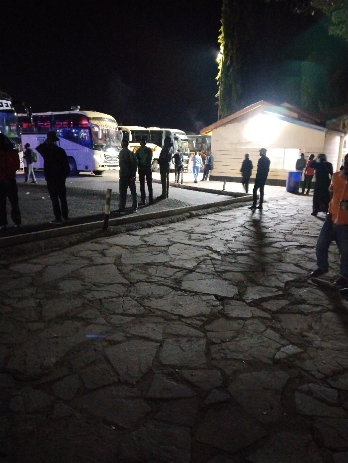 The image depicts a nighttime scene at a bus station or rest stop in Mtito Andei, Kenya