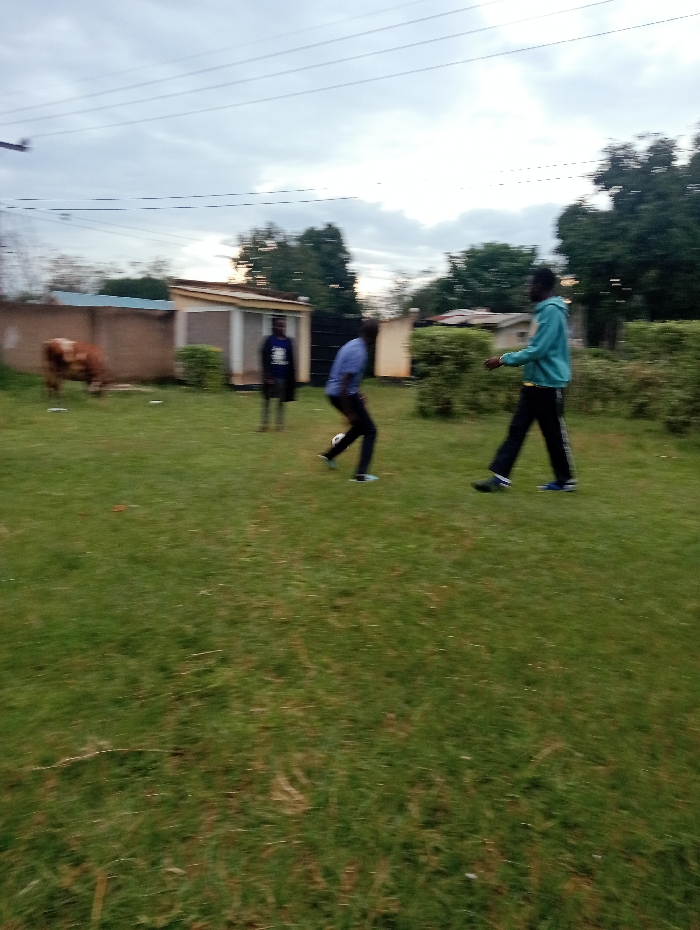 The image displays an outdoor scene in Lumakanda ward, Kenya, centered on a grassy field under an overcast sky. Three males are visible, two actively engaged with a soccer ball, and one observing. In the left midground, a male wearing a blue long-sleeved shirt and dark pants is in motion, positioned as if kicking a white soccer ball. Opposite him in the right midground, another male, dressed in a light blue hooded sweatshirt and dark pants, is also in motion, facing the first individual. In the left background, a third male in a dark blue t-shirt and dark lower garments stands stationary, observing the scene. To the far left background, a brown and white cow grazes on the grass. Behind the cow, a light-colored wall is visible, and behind the stationary male, a small, light-colored building with a darkened entrance stands. Green bushes and trees line the background. Multiple utility lines run horizontally across the upper portion of the sky. The image exhibits motion blur, particularly on the moving individuals.