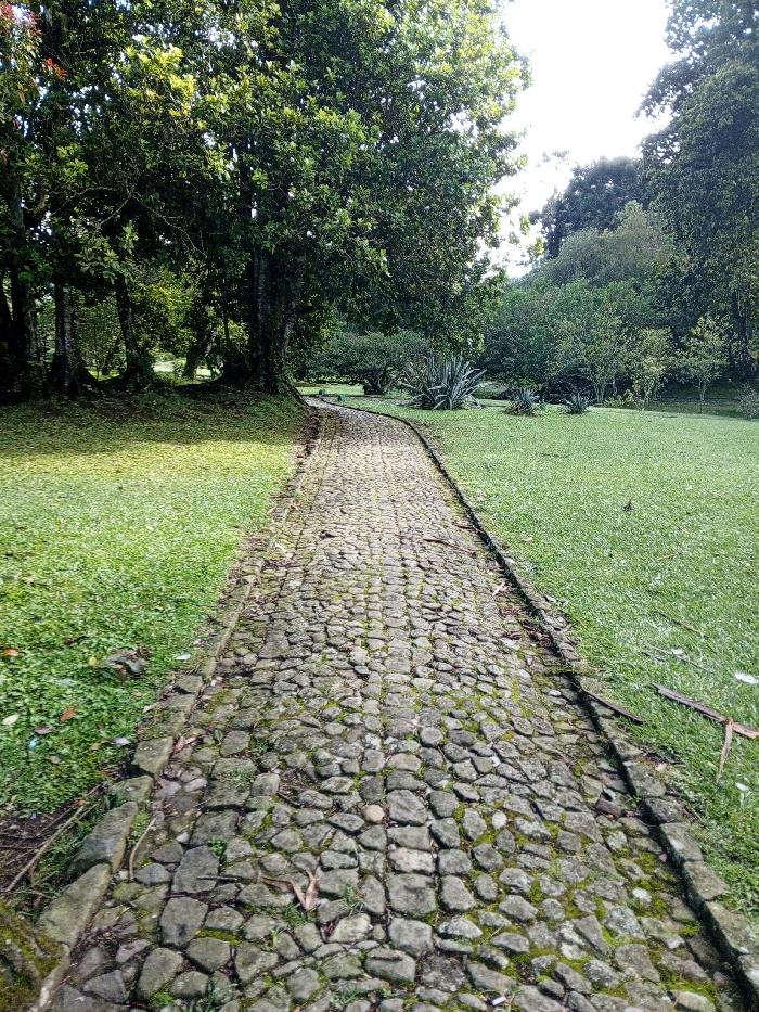 A stone path curves through a verdant landscape. Lush grass borders the path on either side. Towering trees cast dappled shadows across the scene, creating a blend of light and shade. Various plants and vegetation add depth to the backdrop. The pathway leads towards the distance, disappearing into the natural surroundings.