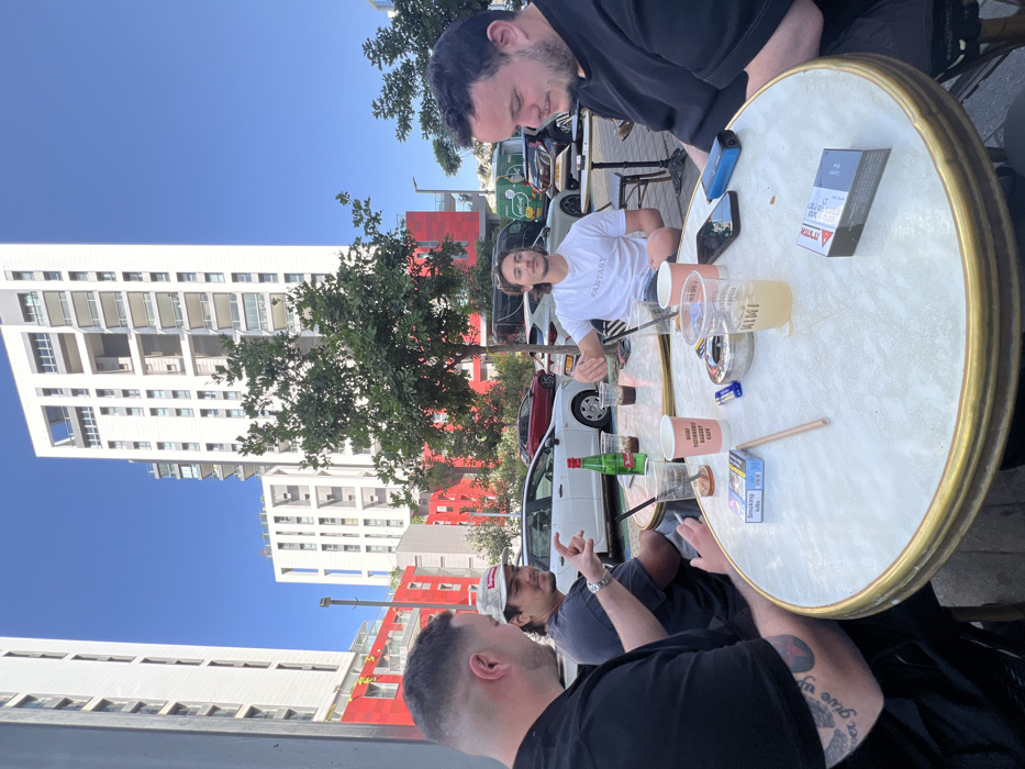 Four adult males are seated outdoors at two round, white marble-patterned tables with golden rims, engaged in a social interaction under a clear blue sky in Herzliya, Israel