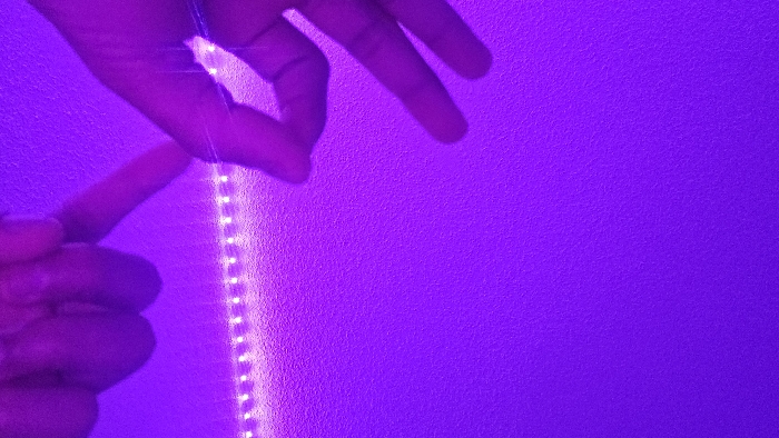 The image displays an indoor scene under intense purple illumination, emanating from a horizontal strip of individual LED lights positioned across the lower-middle portion of the frame. The light casts a uniform purple glow onto a textured wall surface occupying the majority of the background. In the foreground, two human hands are visible. The left hand, located in the lower-left quadrant, has its fingers extended upwards and slightly splayed. The right hand, situated in the lower-right quadrant, shows the thumb and index finger holding a thin, light-colored thread or string. This string is stretched taut horizontally between the fingers of both hands, passing directly in front of the LED strip, which highlights its presence. The specific location within Kamenz - Kamjenc, Germany, cannot be ascertained from the visual information provided.