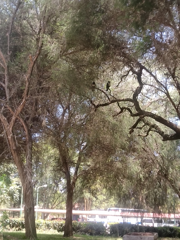 The image captures an outdoor scene in Njoro ward, Kenya, observed through the dense canopy of multiple trees under bright daylight. Two pied birds are perched on a prominent, gnarled tree branch in the upper right section of the frame. The trees exhibit slender trunks with textured bark and abundant light-green foliage. The ground beneath the trees consists of green grass and low-lying shrubbery. In the background, a street light pole is visible on the left, and a row of white vehicles, likely buses, is parked parallel to a light-colored structure, possibly a building or covered walkway. A concrete planter or low wall is present in the lower right foreground. No human subjects are visible.