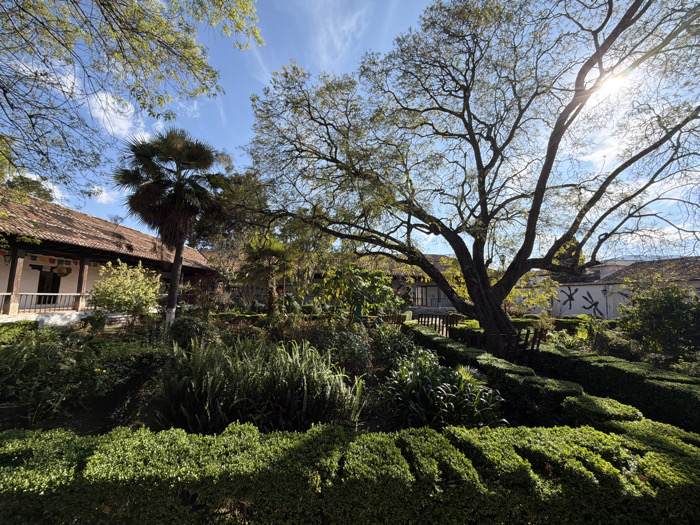 A sunny scene features a garden with neatly trimmed hedges in the foreground. A large tree with sparse leaves dominates the right side, its branches reaching up to the sky. Behind the hedges are various plants and trees, including a palm tree. A building with a red-tiled roof and a covered porch is visible on the left. The sky is blue with wisps of clouds, and the sun shines brightly through the tree branches.