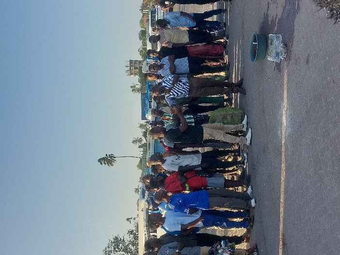 A group of people stands in a line along a street, likely waiting. The line includes individuals of varying ages and ethnicities, dressed in casual clothing. A blue-and-white plastic object sits nearby. The location seems to be a coastal area or near water due to the clear sky and tropical trees in the background. The setting is outdoors on a sunny day.
