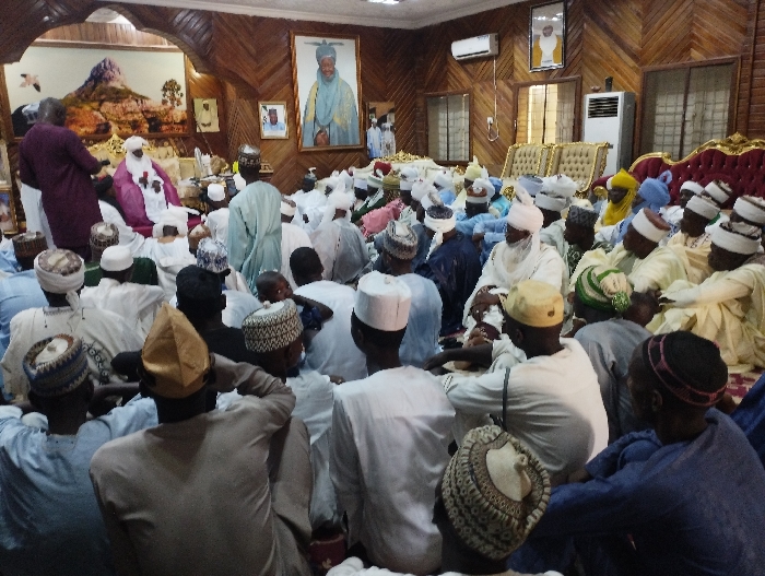 The scene is set in a large room with wood-paneled walls and a high ceiling. There are approximately 40 people seated in rows on the floor. Most of the people are men, wearing traditional white or light-colored clothing and caps. Some women are seated in the back, and a few children are present. The men are engaged in a conversation or a meeting. In the back of the room, there are several gold-framed portraits on the wall, including a large portrait of a man in a white robe. Several air conditioning units are on the walls, and a large, ornate chandelier hangs from the ceiling. The image was taken in the Emir’s Palace in Kaltungo, Gombe State, Nigeria. The coordinates given place the image in the palace's courtyard area, which is a place used for community gatherings, meetings, and ceremonies.