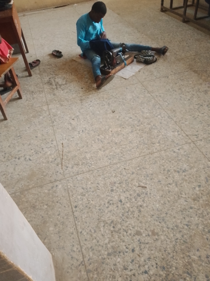 In Rumuekini, Nigeria, a single male individual is depicted operating a manual sewing machine while seated on the tiled floor