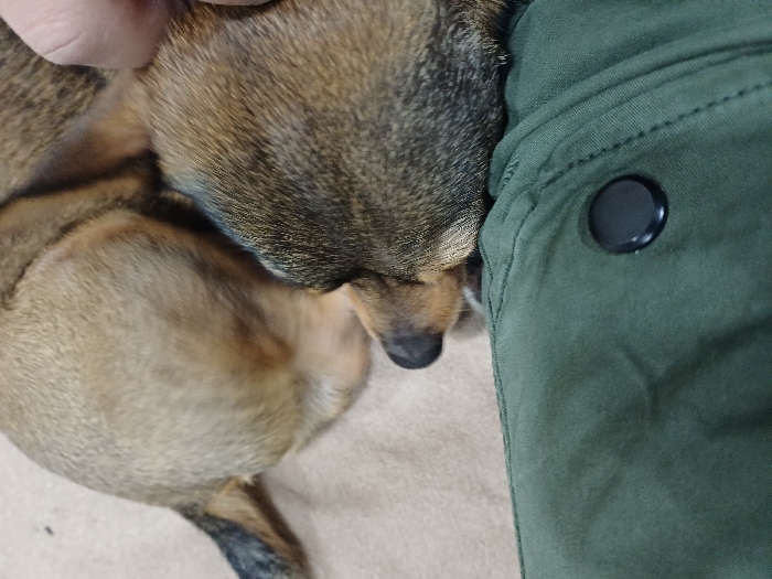 The image depicts a small, short-haired canid, specifically a domestic dog of brown and tan coloration, resting on a light-colored fabric surface. Its head is positioned on a dark green garment, which features a prominent black circular button or snap fastener on its visible section. A human hand is partially visible in the upper right, making contact with the dorsal aspect of the dog's head/neck area. The specific location within the city of Pleven, Bulgaria, cannot be determined from the visual information provided; the environment suggests an indoor, private setting.