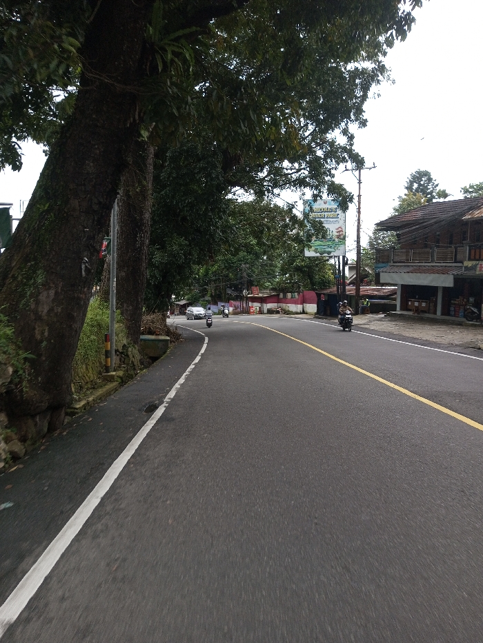The scene depicts a curved asphalt road on an overcast day in Dawathang_Dorjibi_ Kashingtsawa, Bhutan. The road surface is dark gray, featuring a solid white line delineating the left shoulder and a solid yellow line marking the center. On the immediate left, a large, dark tree trunk, covered in moss and ferns, rises, partially obscuring the background foliage. A slender utility pole with a red and white marker is visible behind the tree. Lush green trees and undergrowth line the left side of the road, situated above a stone retaining wall and a small concrete culvert. On the right side of the road, a two-story building with a brown tiled roof and a prominent wooden balcony on the upper floor is visible. The ground floor appears to be a commercial establishment. A person wearing a yellow vest or shirt stands near this building. Adjacent to the building, a tall utility pole supports a large billboard displaying "NICOLE'S WATER PARK," which features images of a water park and a green automobile. Further structures with red roofs are partially visible beyond this area. Vehicular traffic is observed moving away from the viewer. A person on a dark motorcycle is positioned in the foreground on the right lane. Further down the road, a person on a white scooter is visible in the left lane. In the distance, a white sedan is turning left into a side road, with another dark motorcycle nearby. The sky is uniformly light gray, indicating cloudy conditions.