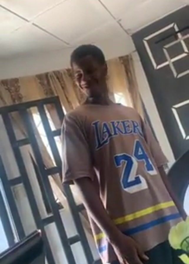 A young man with short hair and a slight smile is standing in a room, wearing a brown Lakers jersey with the number 24 in blue