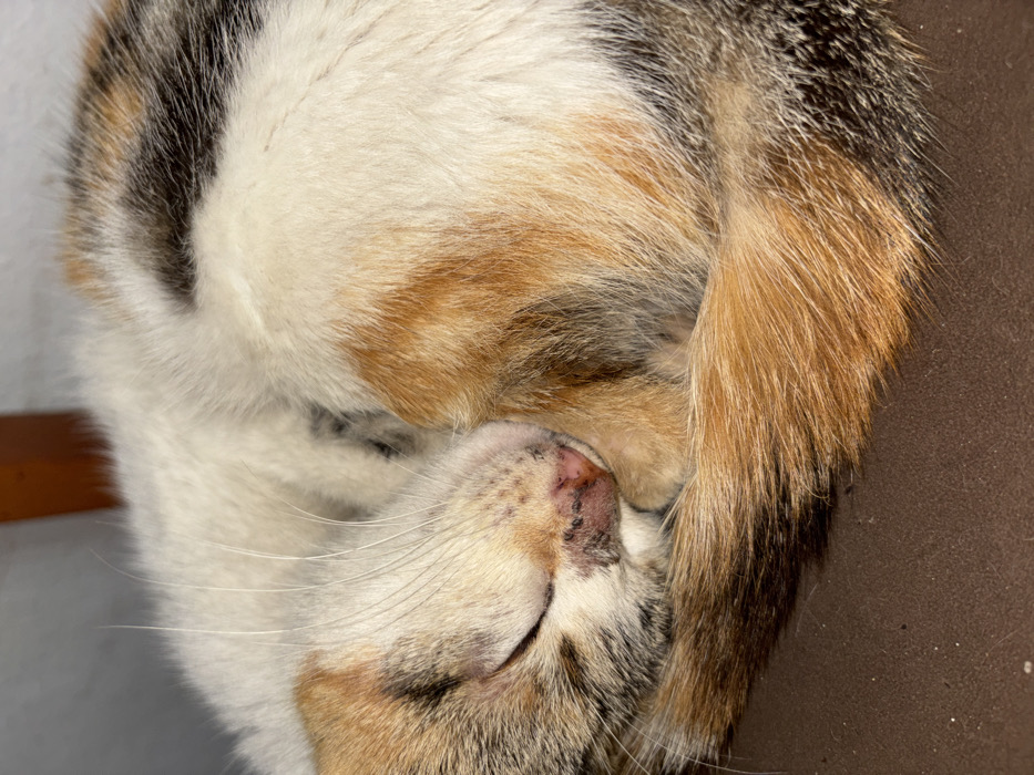 - "A calico cat sleeps curled up, its head nestled into its tail" by FM-YEyMx1, licensed under CC BY 4.0