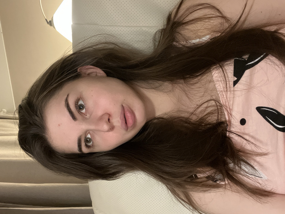 A woman lies on a white, patterned cushion with her head tilted. Her long, brunette hair is spread around her. She has fair skin, full lips, and light eyes. Her expression appears neutral. She wears a pink top with black and white designs. A lamp and curtain are visible in the background.