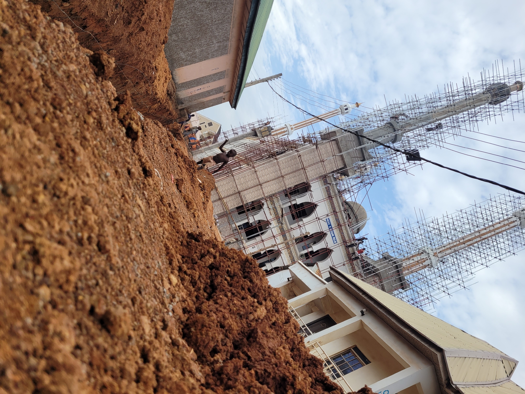 The image, taken in Alizaga, Nigeria, shows a large construction project underway, presumably of a mosque given its architectural elements like the minarets. The view is taken from ground level, partially obscured by a pile of reddish-brown soil in the foreground, causing a tilted perspective. The building is partially covered in scaffolding, indicating ongoing construction work. Several workers are visible on the scaffolding, seemingly involved in the building process. The sky above is partly cloudy. A section of an adjacent building, possibly residential or another structure related to the construction site, is visible to the left of the mosque. Overhead electrical wires are present in the sky.
