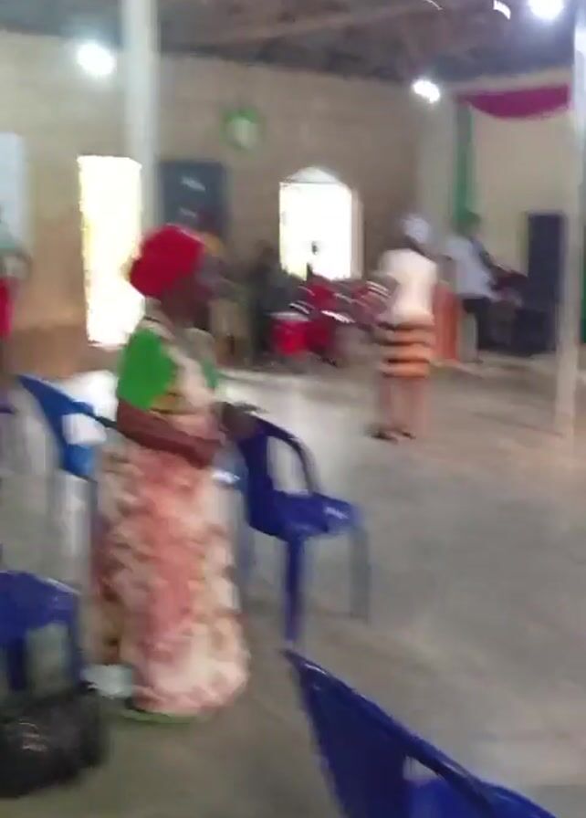 interior of what appears to be a church or community hall. The space is large and sparsely furnished, with a grey concrete floor and a high ceiling supported by wooden beams. In the foreground, a woman in a red headscarf and a floral print dress stands with her hand resting on the back of a blue plastic chair. Several other blue chairs are scattered around the room. In the background, a person is playing a red drum set. A man in a white shirt stands near a red and white podium. A woman in a white top and striped skirt stands between the drumming and the podium, facing the podium. A speaker and a backdrop decorated with green and pink fabric are also visible. The room is lit by fluorescent lights, and natural light streams in through a barred window. The overall impression is that a service or gathering is in progress, with music and speaking elements.