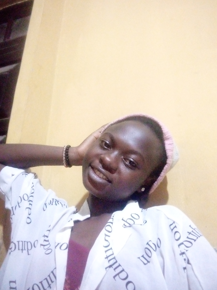 An image captures a young female indoors, presented in a close-up, slightly low-angle shot. The background consists of a plain yellow wall, with a partial view of a dark, multi-shelved structure on the far left. The subject is a young female, appearing to be of Black ethnicity, with dark skin and dark hair covered by a light pink and white patterned beanie. She is smiling and looking directly into the camera. She wears a white collared shirt with repeated black text patterns, and a dark red/maroon undergarment is visible beneath the unbuttoned shirt. Her left arm is raised, with her left hand resting on the back of her head or upper neck. Two dark beaded bracelets are on her left wrist, and a small, light-colored stud earring is visible in her right ear.
