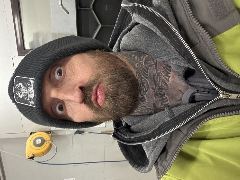 A light-skinned man with a beard and neck tattoos wears a black beanie with a logo on the front