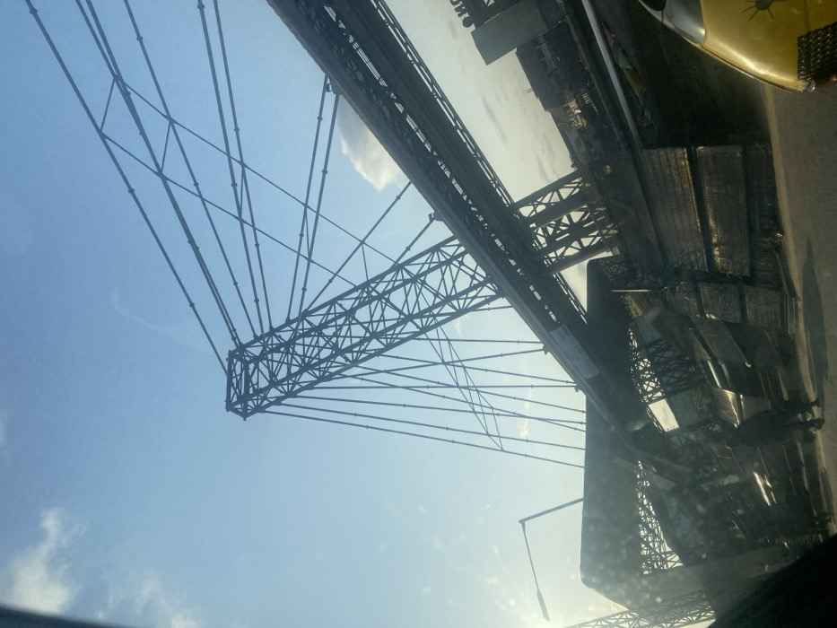 The image captures a daytime scene in Ikeja, Nigeria, specifically focusing on a large, dark-colored metal truss structure consistent with the ongoing construction of the Pen Cinema Flyover. The structure, observed from a low, upward angle, spans diagonally across the frame, showcasing a complex network of beams and numerous taut cables against a bright blue, partly cloudy sky. Below the main elevated structure, on what appears to be a paved roadway, multiple large, dark, rectangular components or debris are arranged or stacked. One individual, dressed in dark clothing, stands on the roadway near these components. A portion of the rear of a yellow vehicle is visible on the far right. Distant urban structures and a hazy horizon are faintly discernible in the background. The photograph displays reflections consistent with having been taken through a vehicle's window.